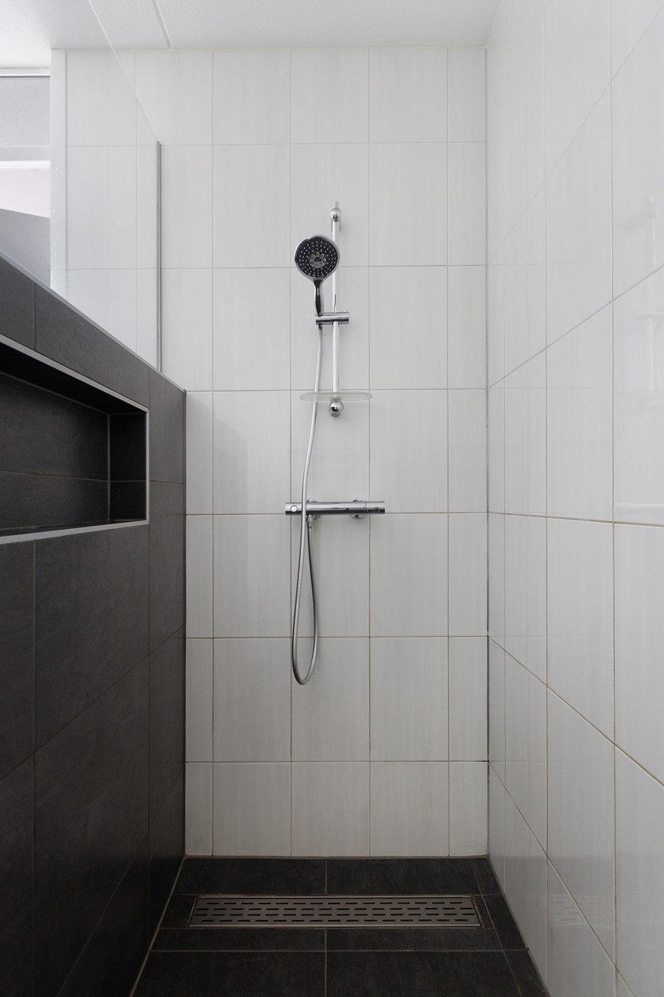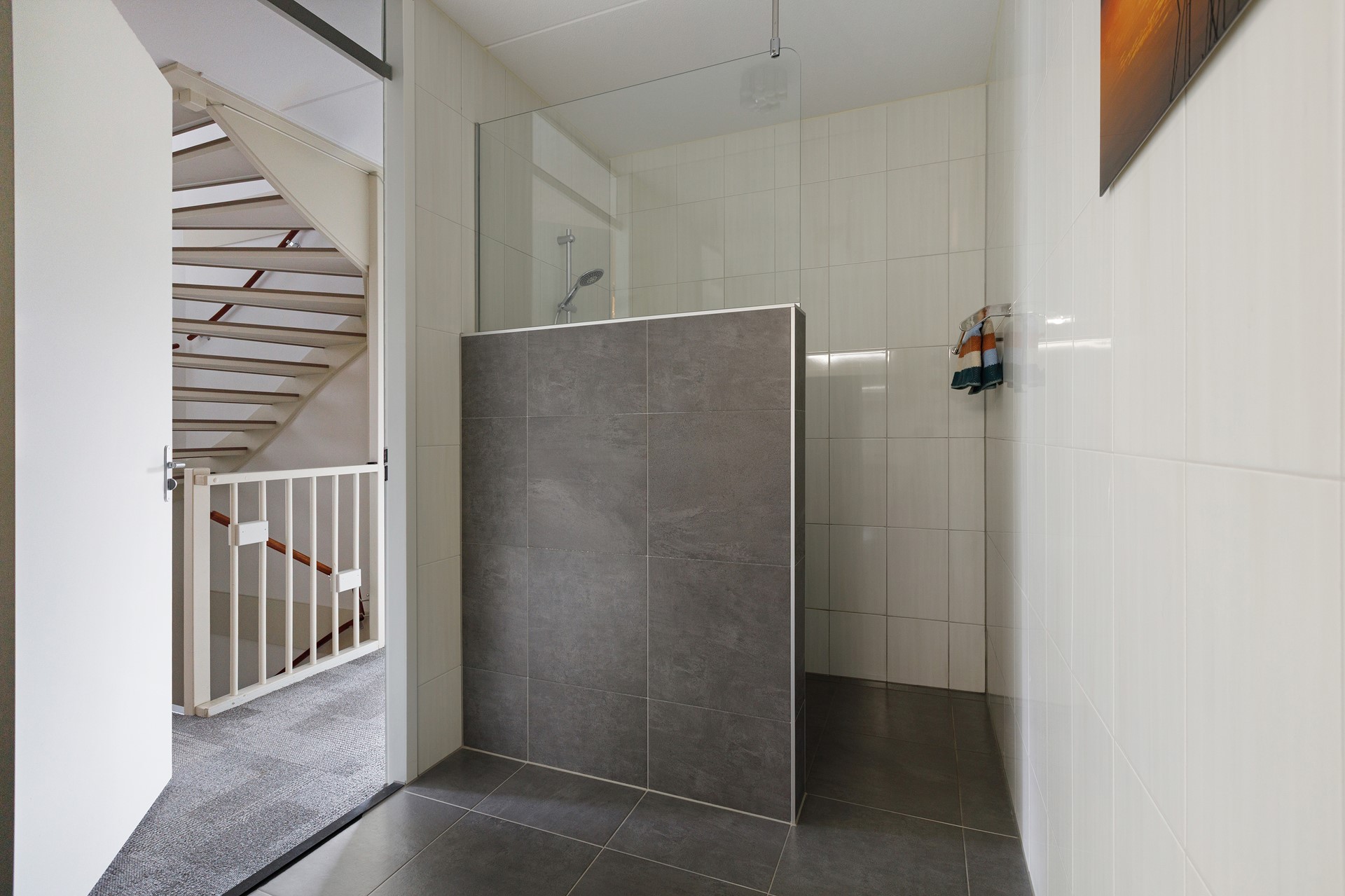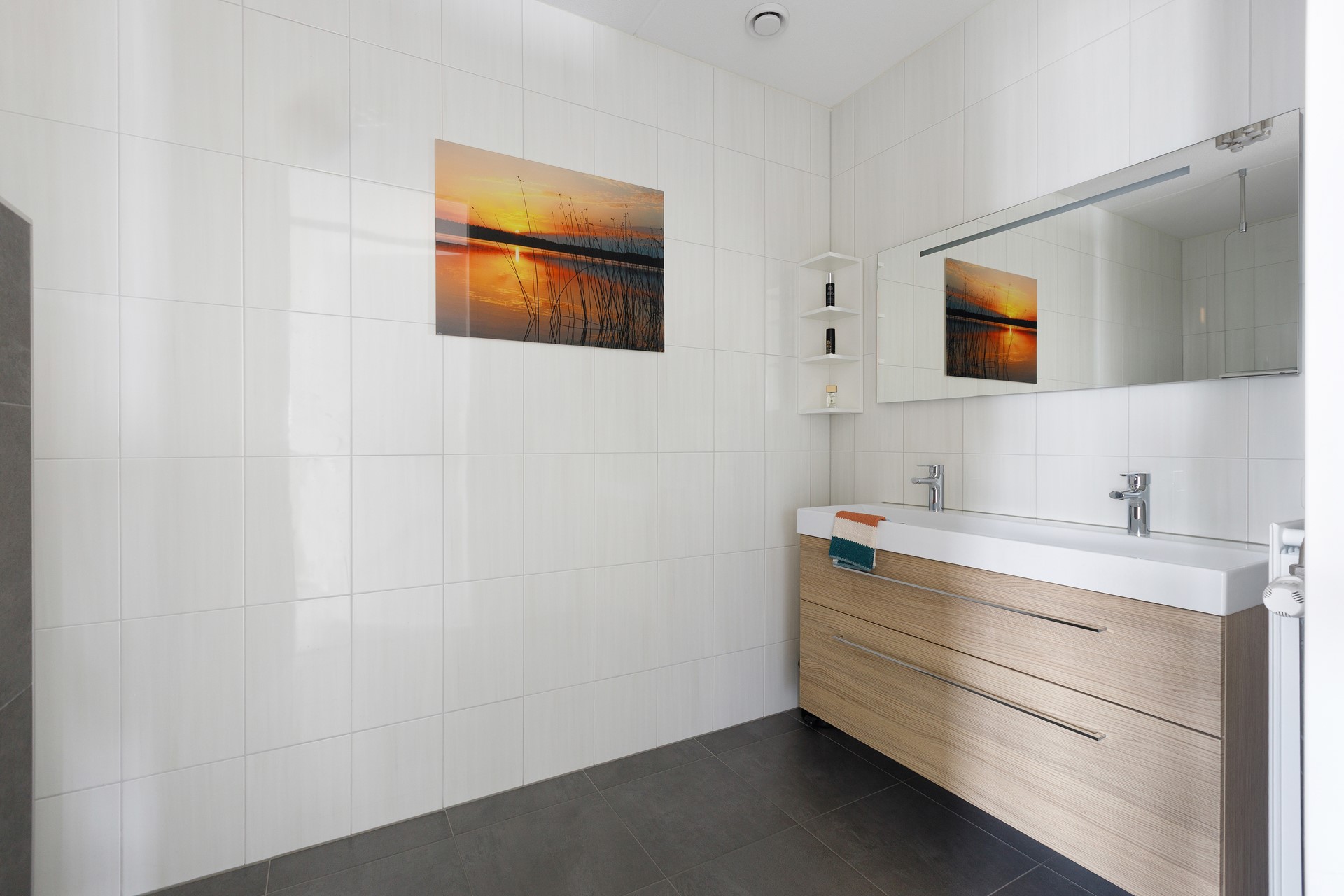 De badkamer is functioneel ingericht en voorzien van een ruime inloopdouche, wastafelmeubel en spiegel. Er is een apart toilet met wastafel.