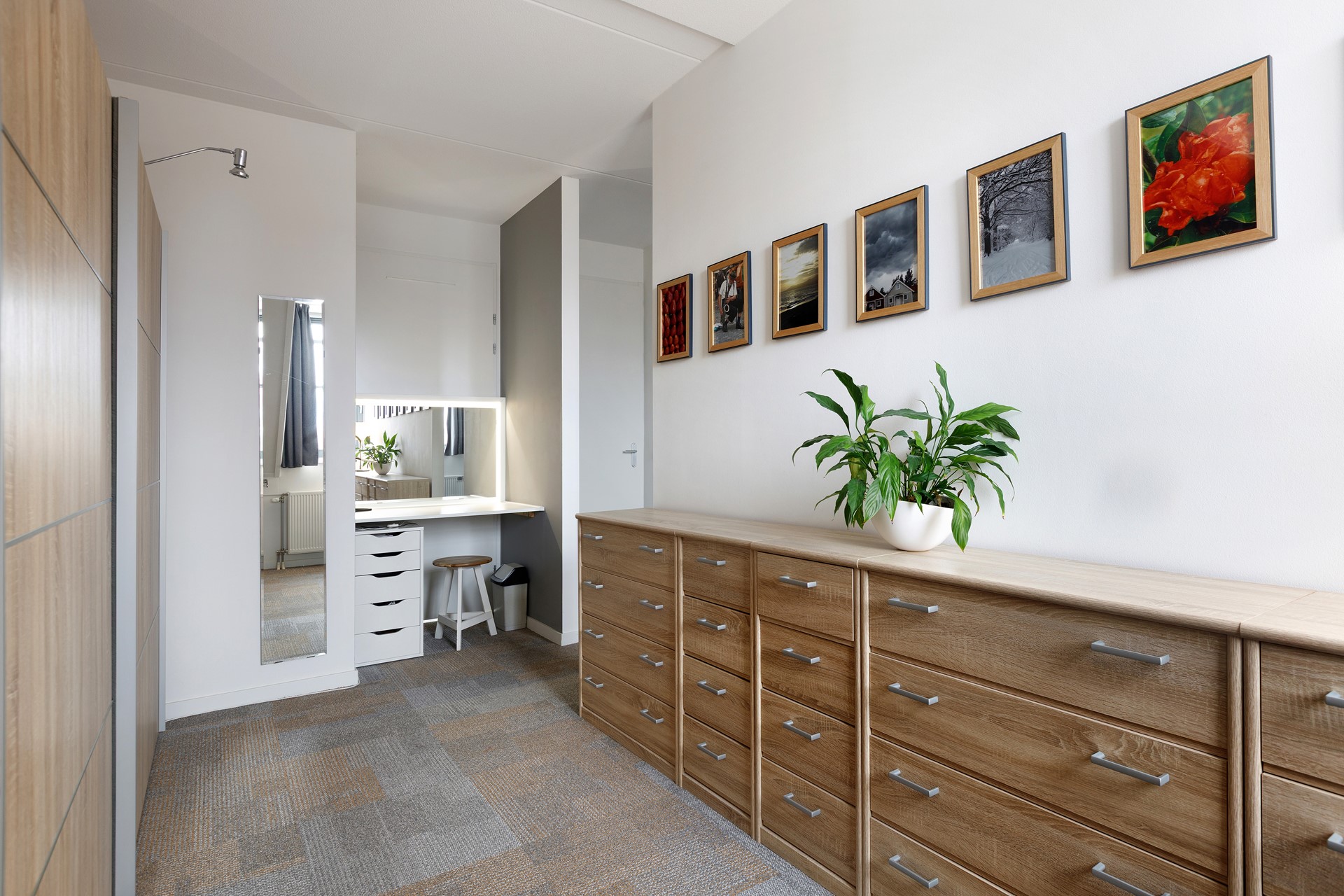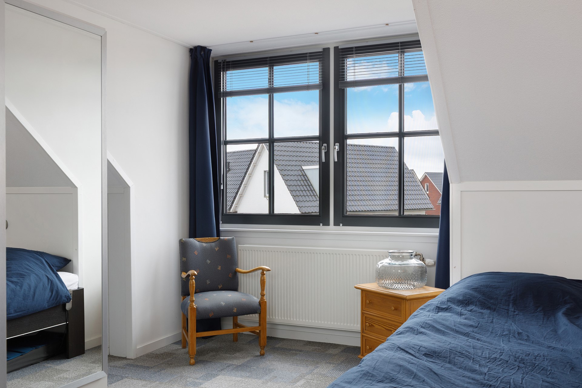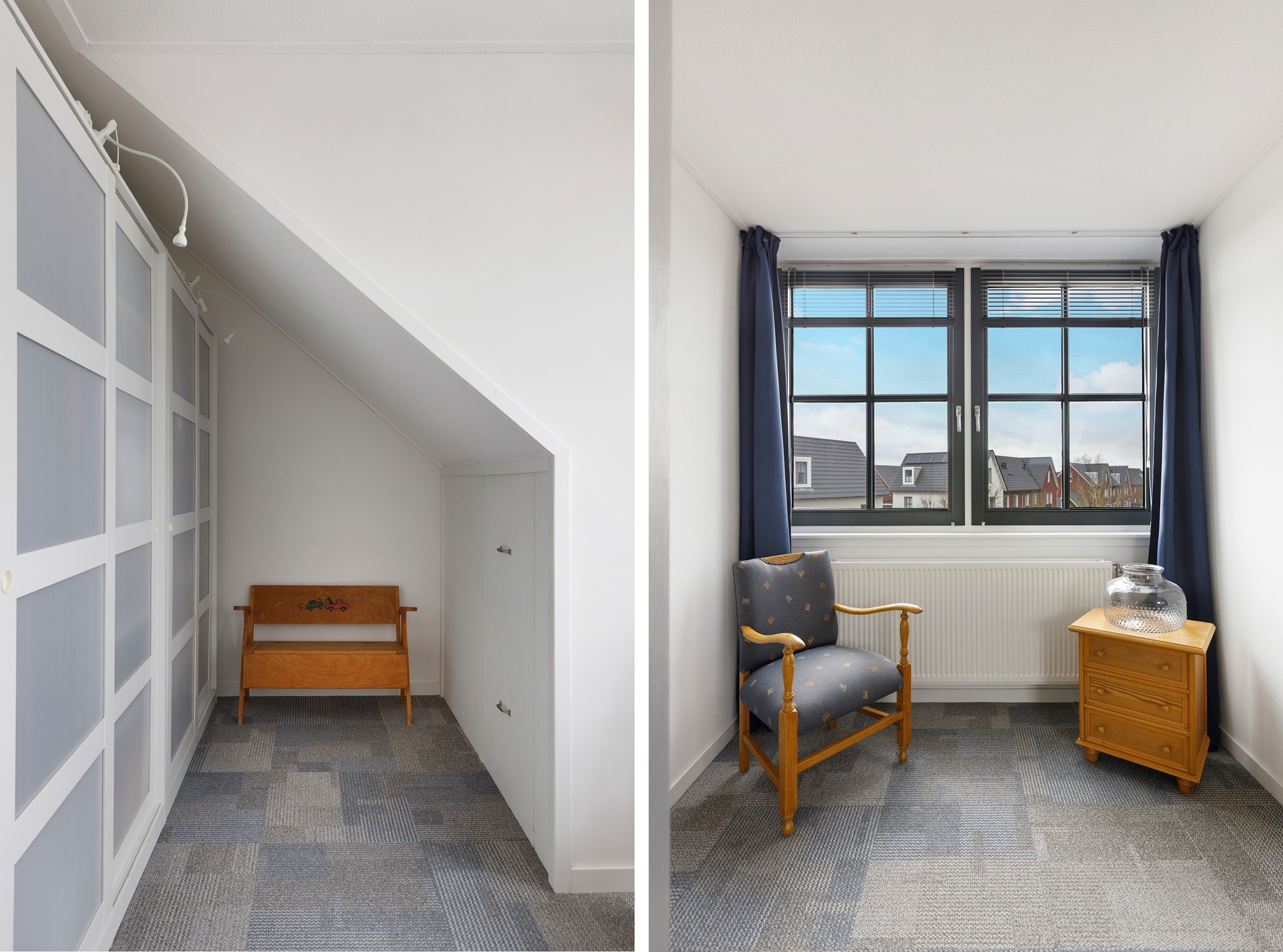 Op de eerste verdieping bevinden zich twee slaapkamers, elk met een prettige lichtinval en goed bruikbaar oppervlak. Eén van deze slaapkamer heeft een aangrenzende inloopkast (oorspronkelijk de derde slaapkamer), ideaal als dressing of extra bergruimte. Van deze inloopkast kan eenvoudig een extra slaapkamer worden gecreëerd. Deze kamers zijn geschikt als slaapkamer, kinderkamer of werkkamer.