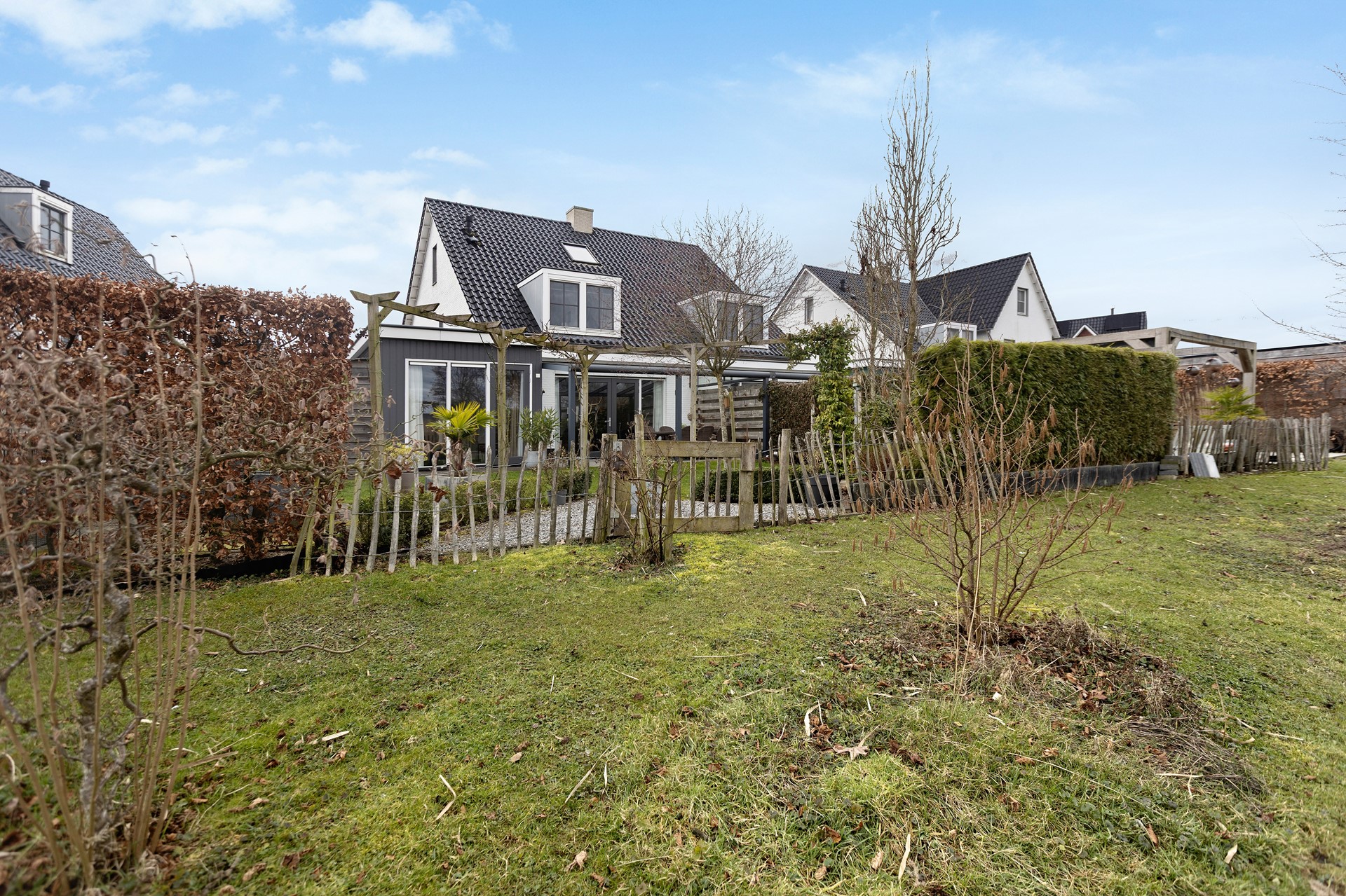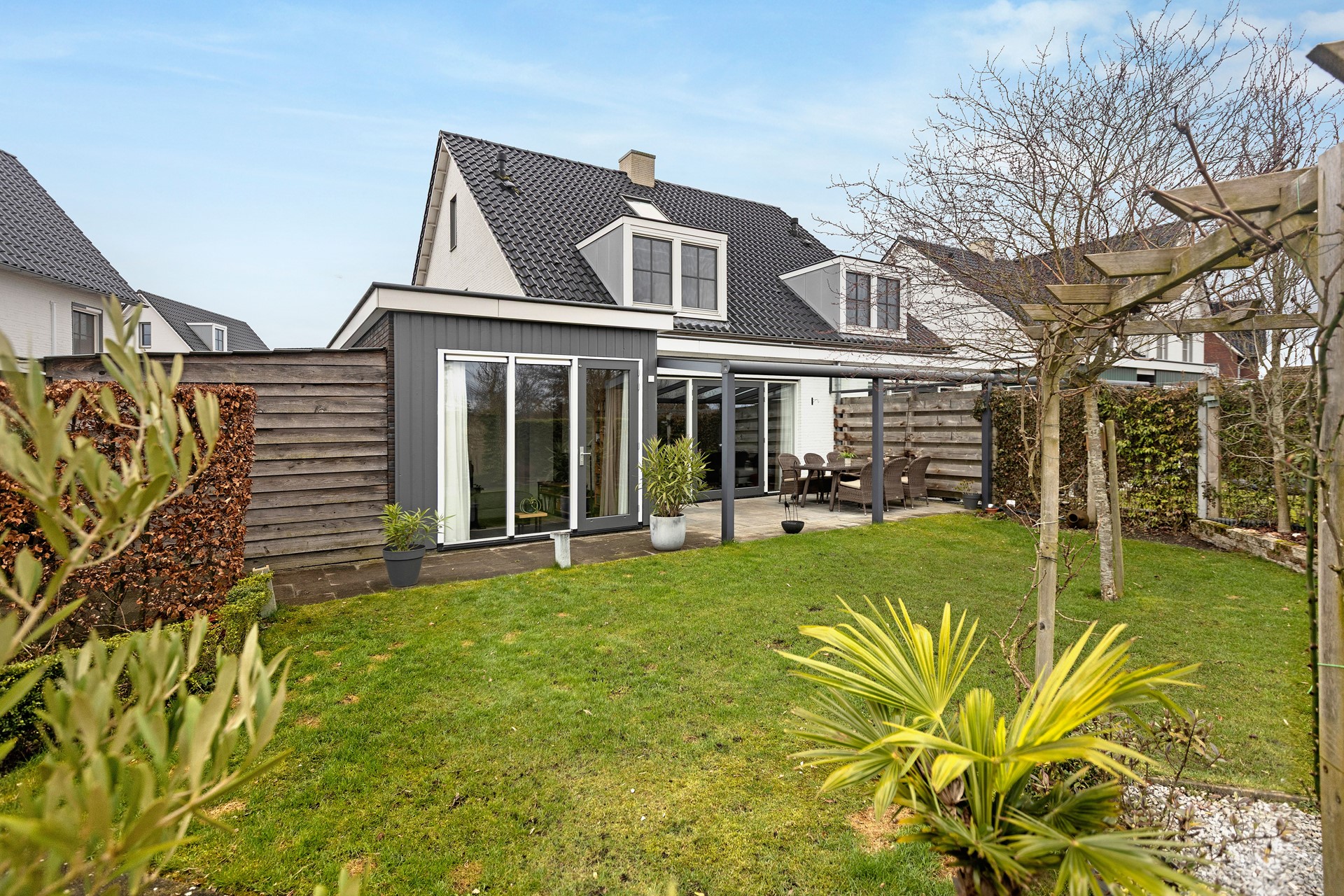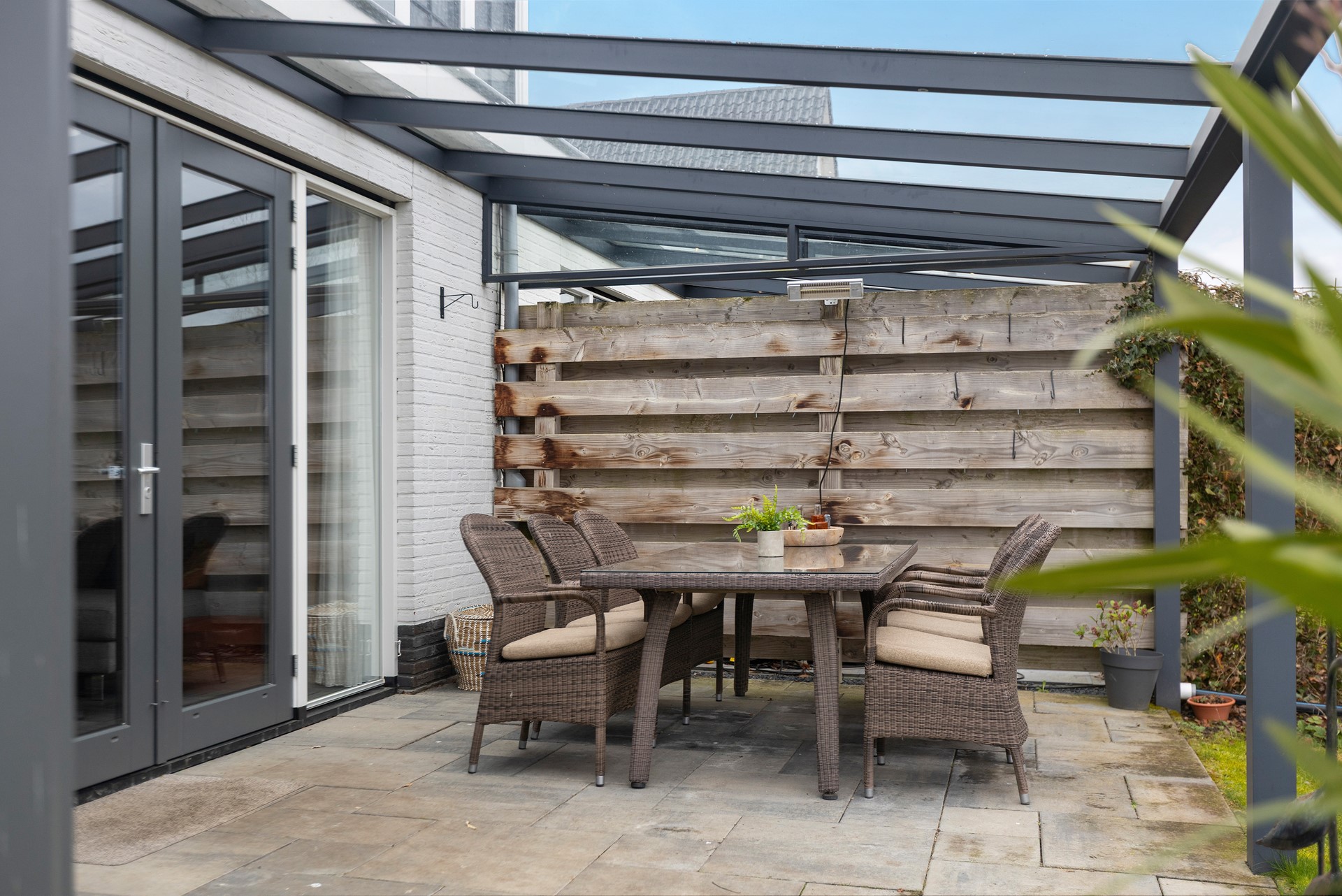 De ruime achtertuin met overkapping is verzorgd aangelegd en biedt volop privacy. De achtertuin is direct bereikbaar via de woonkamer, om het comfort en de verbinding tussen binnen en buiten goed te benadrukken. Hier kun je heerlijk ontspannen, genieten van de zon of gezellig buiten eten. Er is voldoende ruimte voor een terras, speelgelegenheid of het plaatsen van tuinmeubilair.
