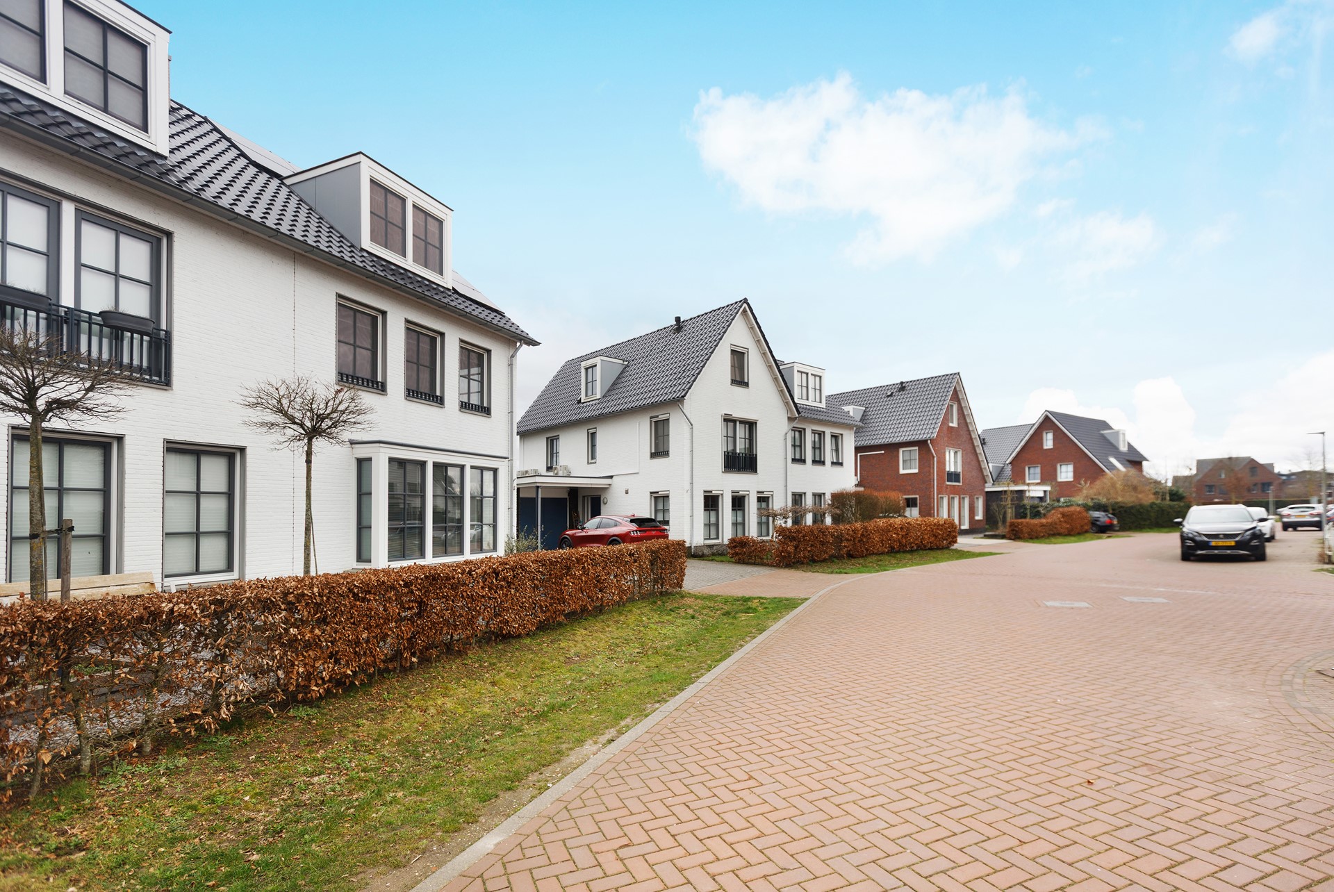 Voordat je de woning betreedt, kom je uit bij de voordeur met een stijlvolle overkapping, waar zich tevens een laadpaal voor de auto bevindt.