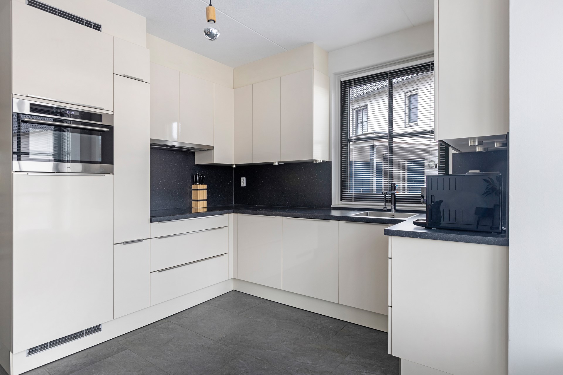 De keuken is praktisch ingericht en voorzien van diverse inbouwapparatuur waaronder een afzuigkap, koelkast, combimagnetron en vaatwasser. De indeling maakt de keuken functioneel en efficiënt, met alles binnen handbereik. Bovendien biedt de keuken voldoende ruimte om eventueel een eethoek te realiseren of extra kastruimte toe te voegen, afhankelijk van je wensen.