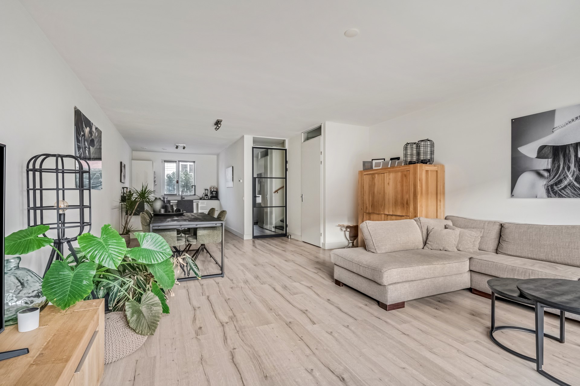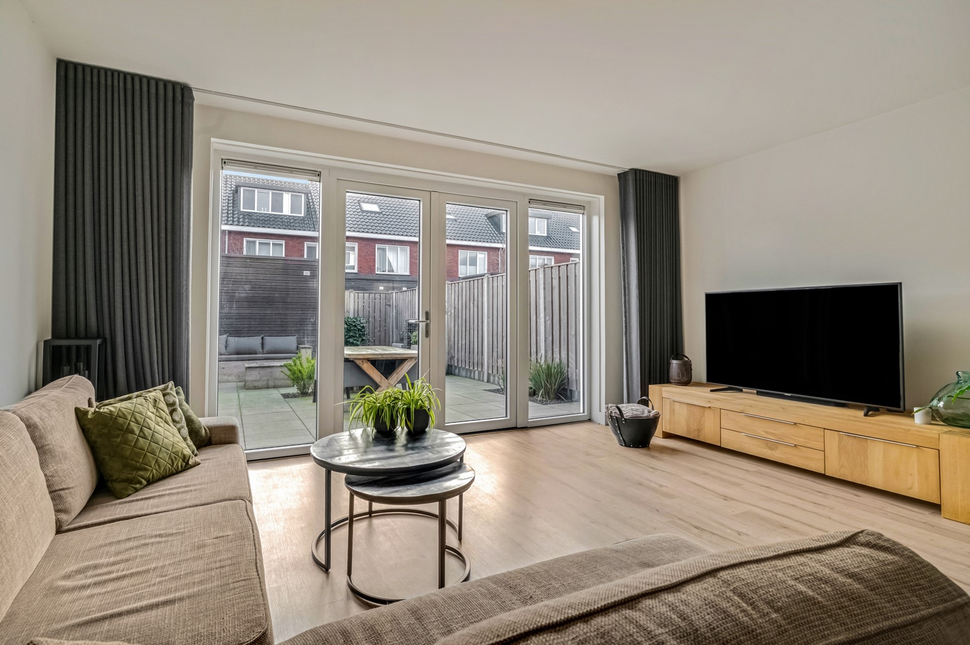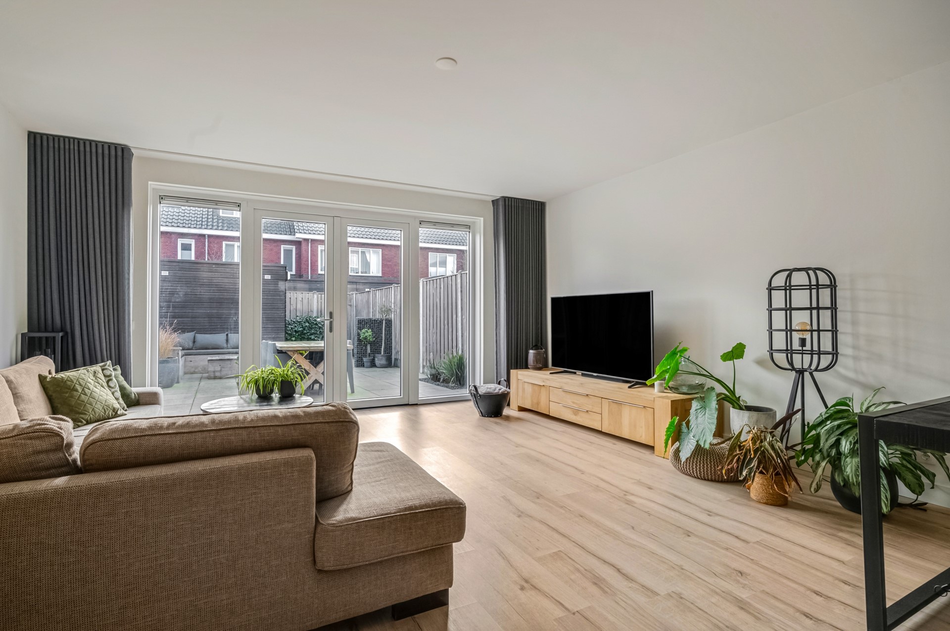 De moderne uitgebouwde woonkamer is licht en sfeervol, afgewerkt met een lichte moderne vloer en voorzien van openslaande tuindeuren naar de zonnige en diepe achtertuin. De open keuken is een echte eyecatcher en beschikt over een lichte luxe inbouwkeuken met kookeiland en is compleet met inbouwapparatuur.