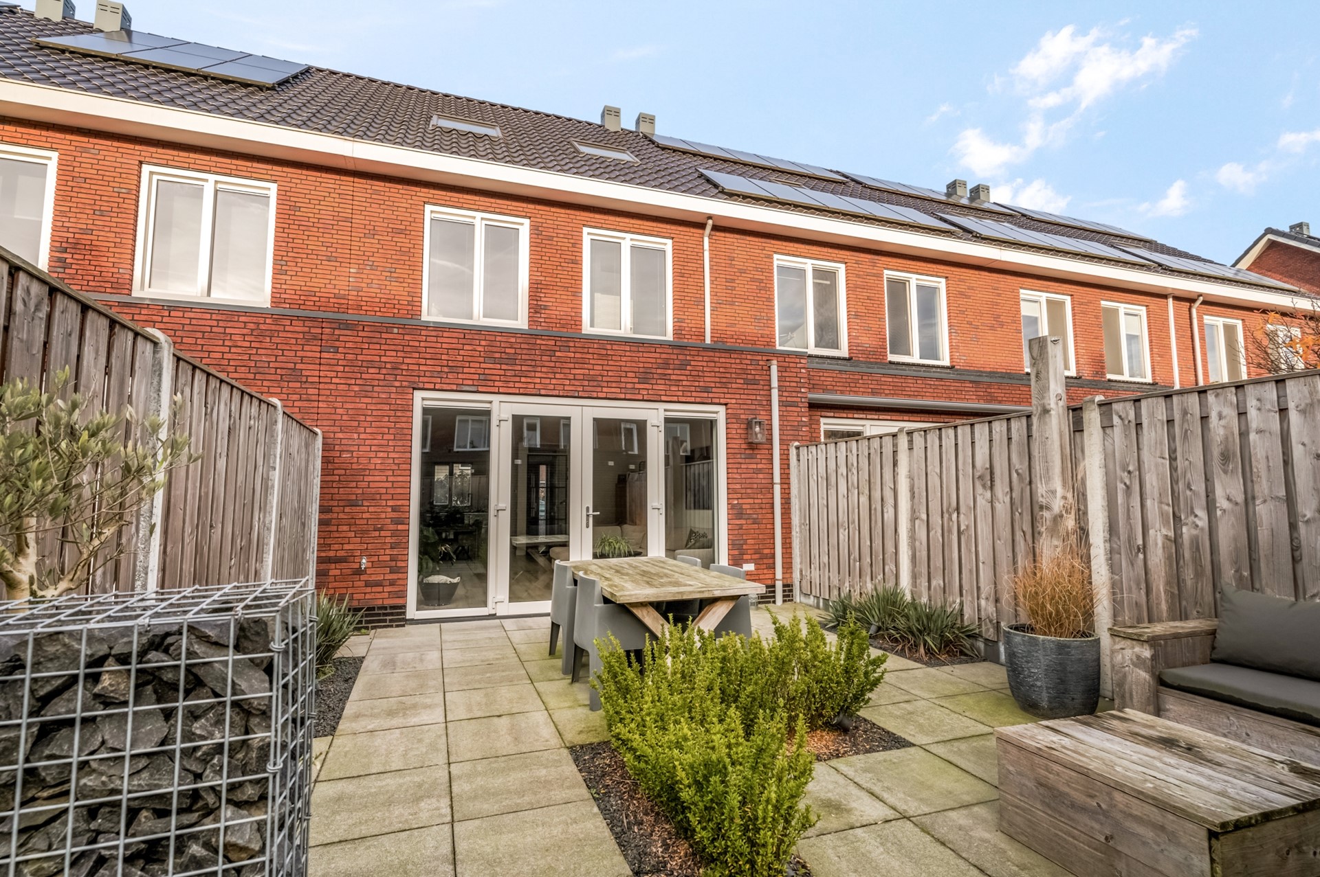 De zonnige achtertuin op het zuiden is volledig omheind en verzorgd aangelegd met bestrating en diverse beplanting. Achterin de tuin staat een houten berging voor fietsen en tuinspullen. De tuin is bovendien bereikbaar via een achterom.