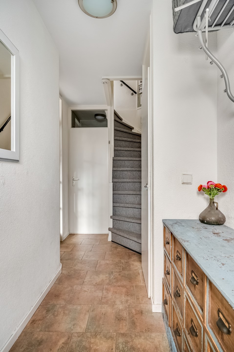 De woning is zowel aan de voorzijde als aan de achterzijde goed toegankelijk. Via de voordeur betreed je de woning en kom je in de hal met hierin de meterkast, de ruime vernieuwde moderne toiletruimte met zwevend toilet en fonteintje en de trapopgang naar de 1e verdieping.