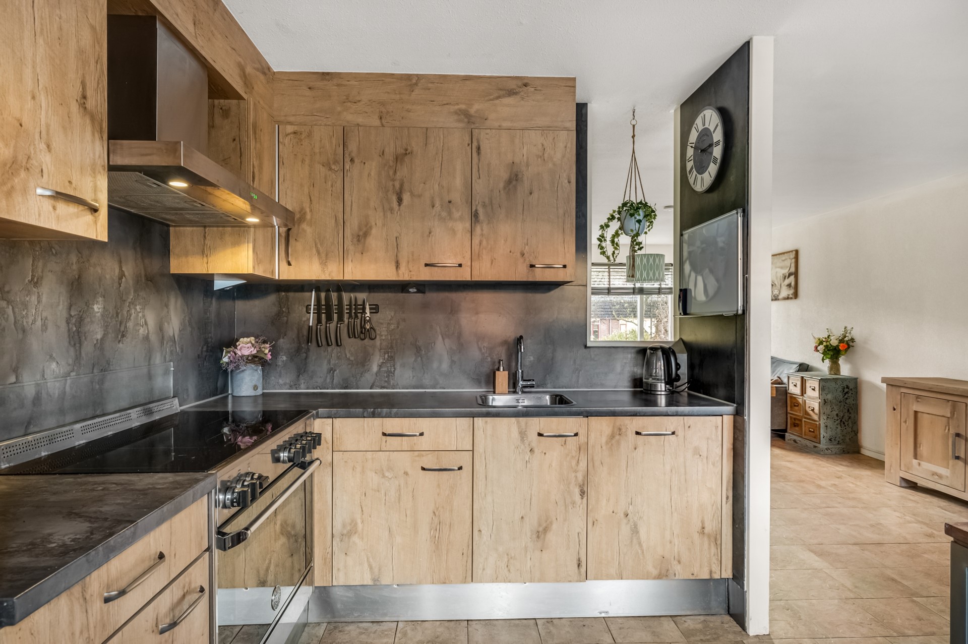 De woonkamer is ruim en licht dankzij de grote raampartijen en biedt toegang tot de eetkeuken. De keuken is in 2021 voorzien van een nieuwe inbouwkeuken, compleet met een fraai inductiefornuis, afzuigkap, vaatwasser en een losse koel/vries-combinatie. Er is een speelse doorkijk gecreëerd, waardoor je gezellig contact houdt met je gasten terwijl je iets klaarzet.