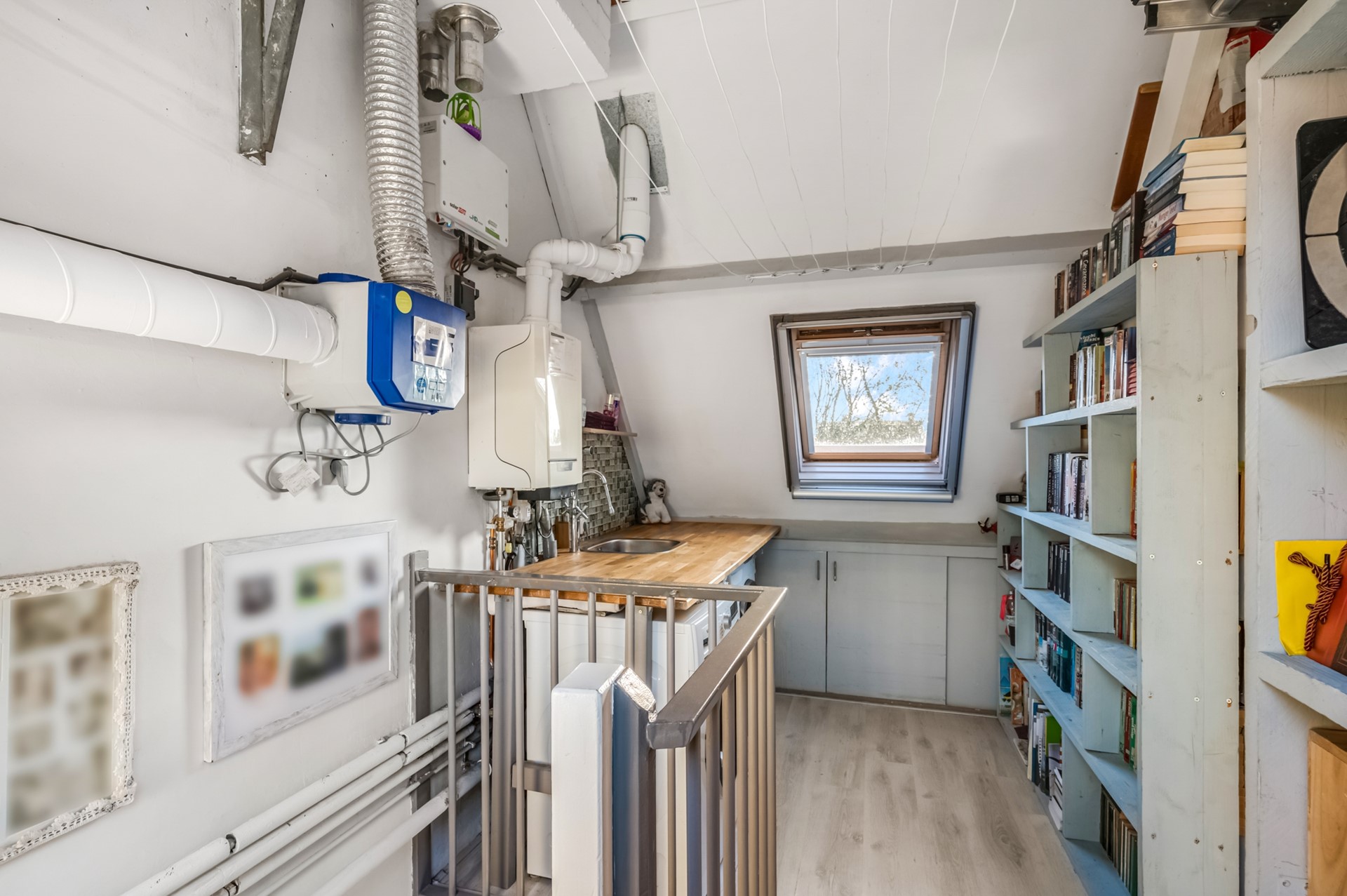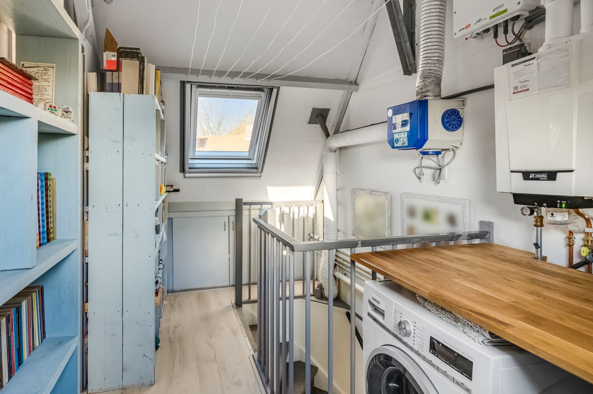 Via de vaste trap bereik je eerst de overloop, het technische hart van de woning. Hier bevinden zich een werkblad met spoelbak, de aansluitingen voor wasmachine